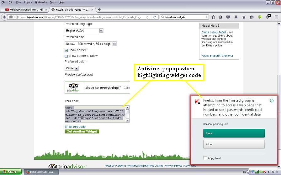 By embedding the widget code you would thus facilitate theft of credit card details and personal data from visitors of your own website (your customers) via this TripAdvisor widget.